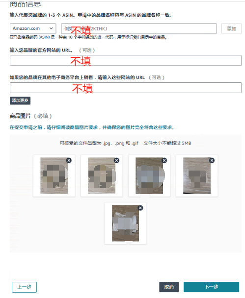 商品图片。上传带有商标的LOGO的产品图,(在申请中,请至少提交一张商品图片或商品包装图片)点击下一步。